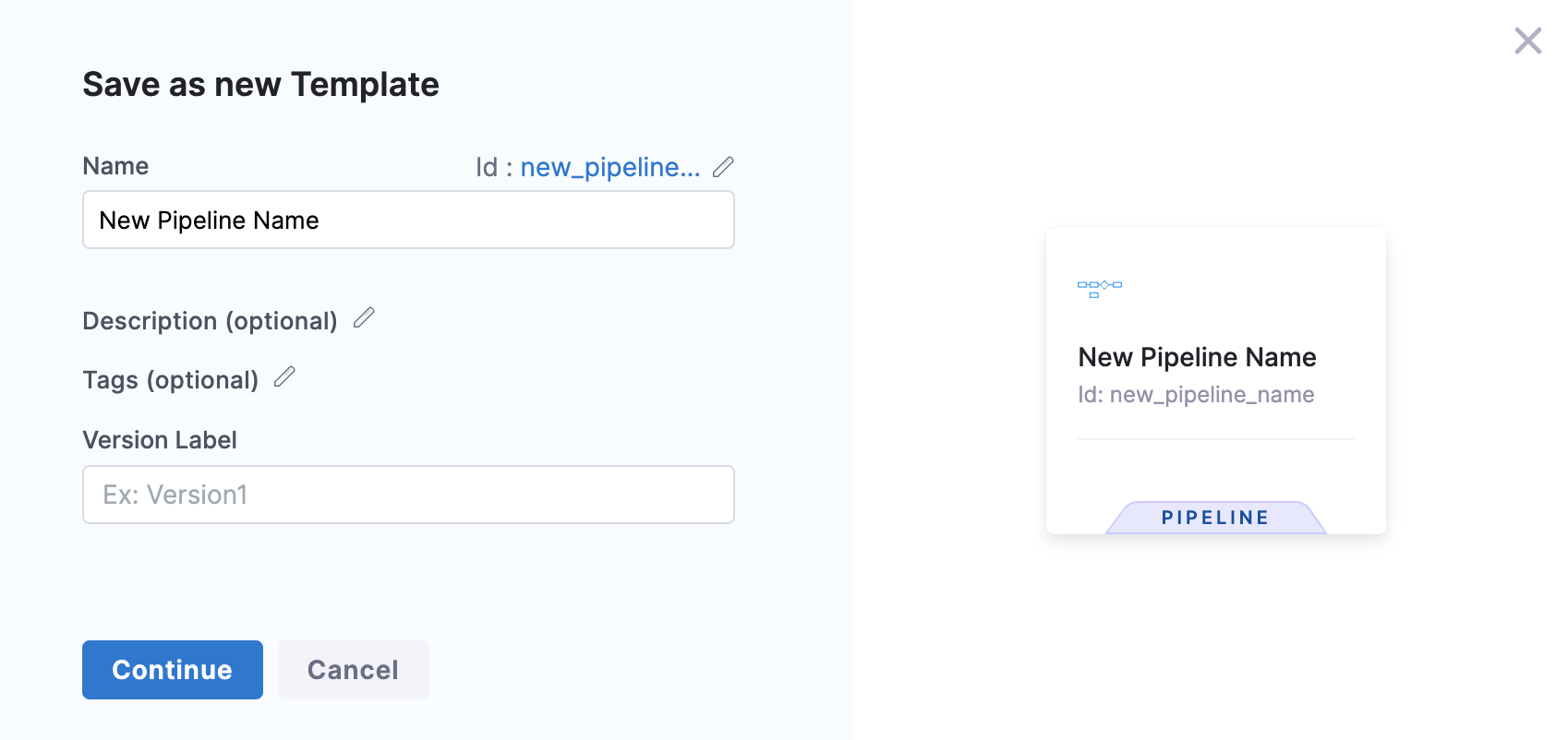 Select + New Template, and then select Pipeline. The Create New Pipeline Template settings open.